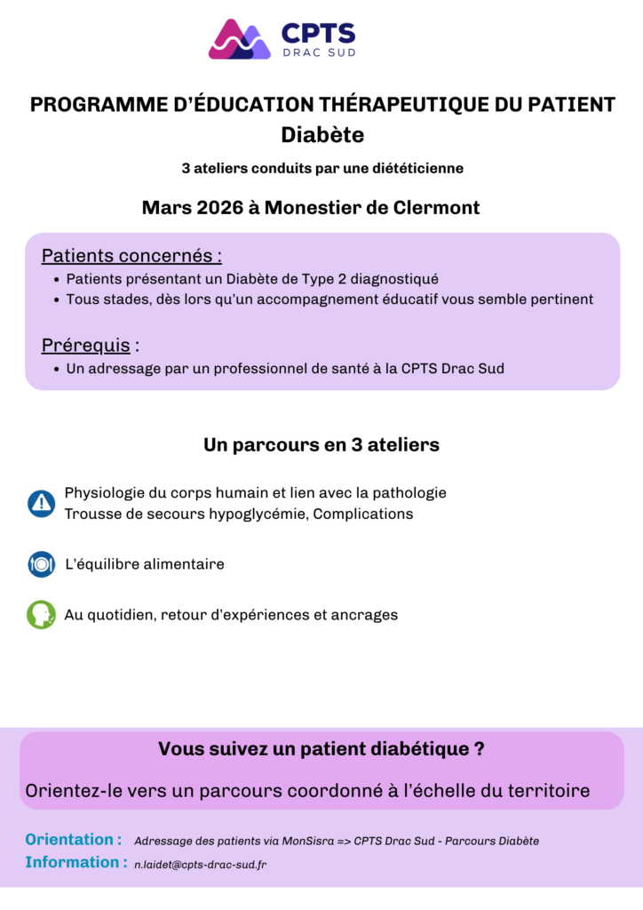 - via MonSISRA / MesPatients : en cherchant les équipes dédiées : CPTS DRAC SUD Parcours Diabète et CPTS DRAC SUD Parcours IC